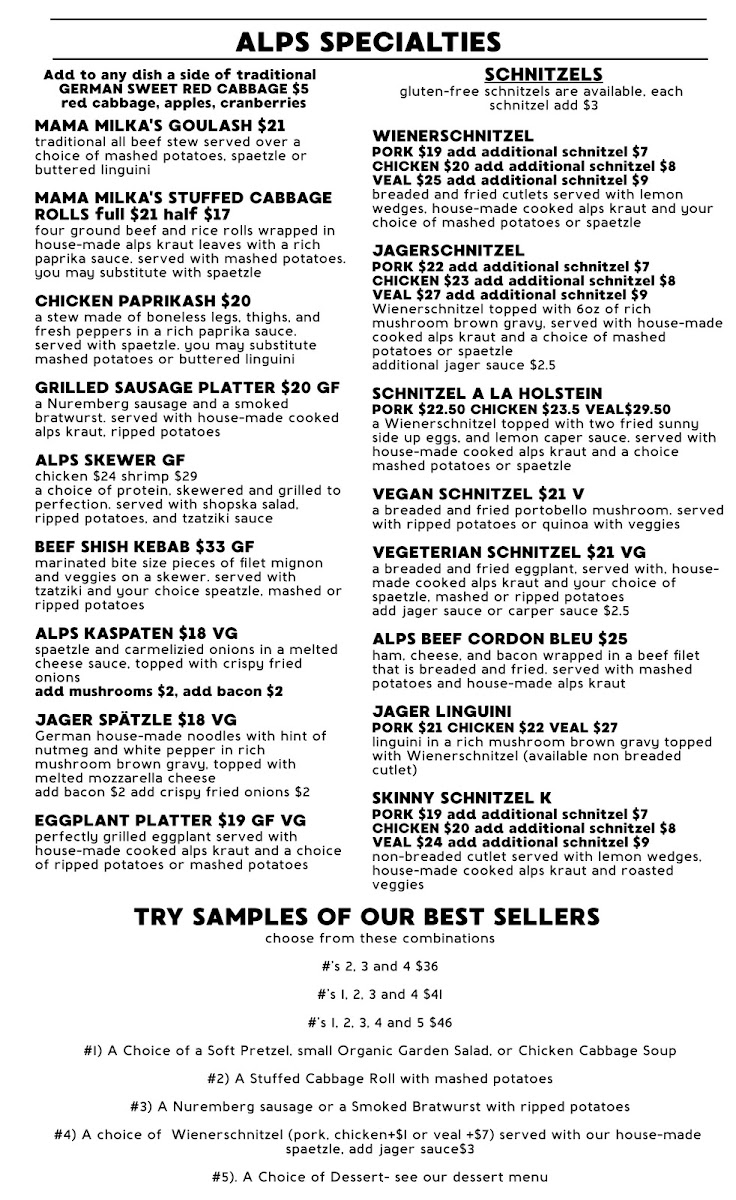 At Alps Village, you’ll find a diverse and mouthwatering menu that highlights traditional dishes, such as the Jägerschnitzel accompanied by a rich mushroom gravy that has been lovingly crafted to perfection. Guests rave about the Paprika Schnitzel, also known as gypsy schnitzel, which introduces a delightful twist with its vibrant flavors. But that’s not all—customers adore the comforting goulash and the crispy, satisfying Weinerschnitzel that are sure to enchant your taste buds.